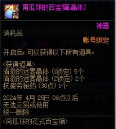 晶体百宝箱打开之后会直接获得5个1锁定的清澈的迷雾晶体、2个2锁定的清澈的迷雾晶体、30抗疲劳秘药。而徽章百宝箱打开之后可以直接获得玲珑徽章升级券和灿烂的徽章自选礼盒。