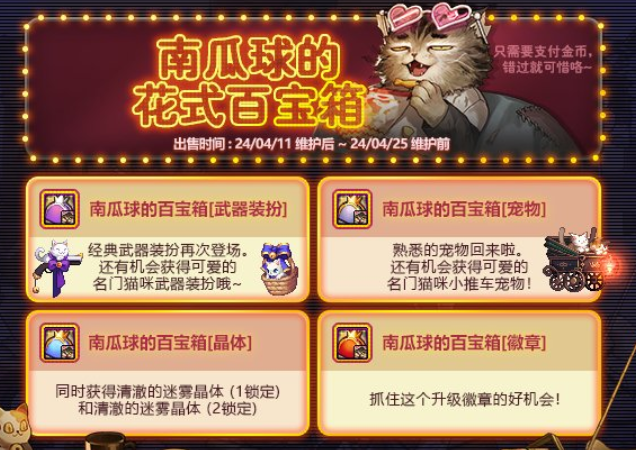 4.11版本更新之后,南瓜球的花式百宝箱活动就会上线,该活动将会返厂往期经典武器装扮和宠物,并且会有全新的猫咪武器装扮和宠物上线。那么具体内容有哪些?有什么值得留意的装扮呢?下面笔者为大家详细解读一下。