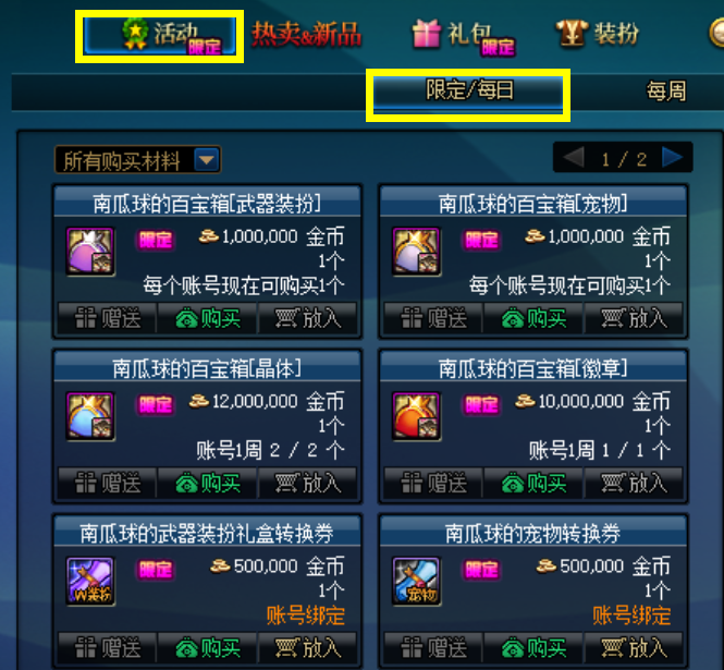 商城中使用金币即可直接购买道具与使用。活动跨度2周,最多可购买4个晶体宝箱、2个徽章宝箱、1个武器装扮/宠物宝箱。开出的武器装扮/宠物非心仪选项,可使用对应转换券随机转换成奖池中的一种。