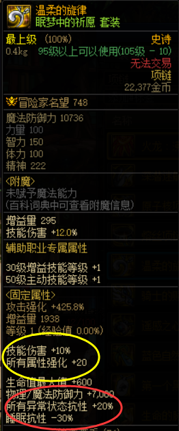 睡眠项链经过改版之后已经无需任何睡眠流装备,直接就有10%技伤和20点全属强,最重要的是可以获得20%所有异常状态抗性,轻松触发魔女戒指的50%异抗词条,是目前比较常见的触发魔女戒指的通用搭配。