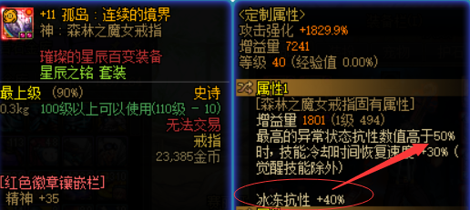 魔女戒指的“异常状态抗性高于50%时,获得30%技能冷却时间恢复速度”,这基本是全职业都需要的补充CD词条,而该词条本身自带40%冰冻抗性,所以小伙伴们只需单独再堆10%冰冻抗性或全异常状态抗性即可触发。