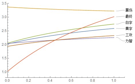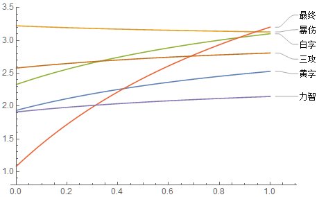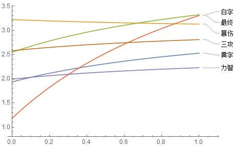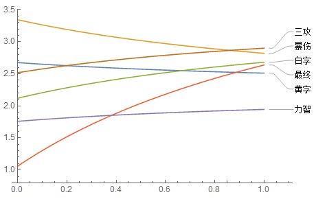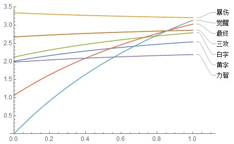 可以看到,在觉醒有效率为100%时(对应爆发时期),各个词条提升率顺序为暴伤>觉醒>最终>三攻>白字>黄字>力智。