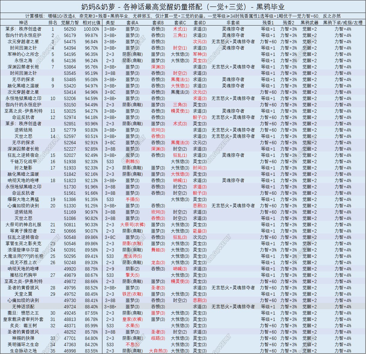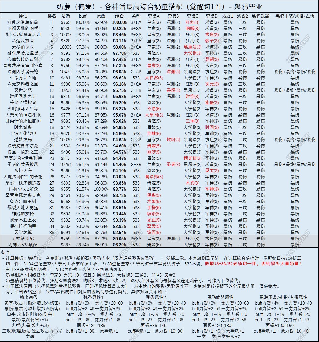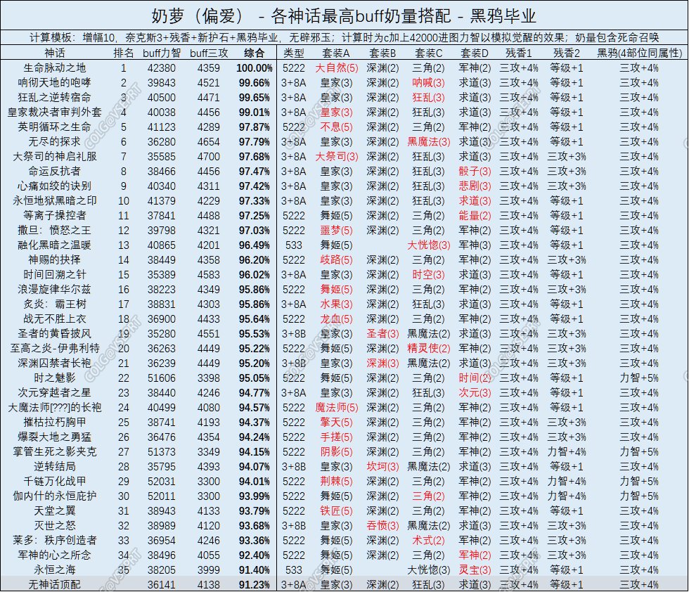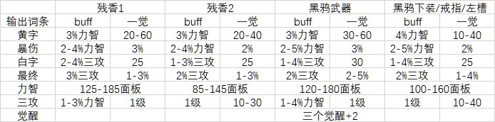 可以发现,从残香2到黑鸦下装,三攻词条仅仅提升了10一觉力智(约等效0.6%一觉力智,视具体搭配、打造等而定),而其它词条都是把某个奶量词条数值提升了1%,所以在黑鸦属性中,buff+1的地位变低了,因此通常不推荐选择。
