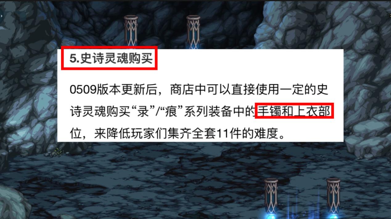 5.09版本更新后,商店中可以直接使用【一定的史诗灵魂】,购买【录/痕系列装备】中的【手镯和上衣】部位,来降低玩家们集齐全套11件的难度。