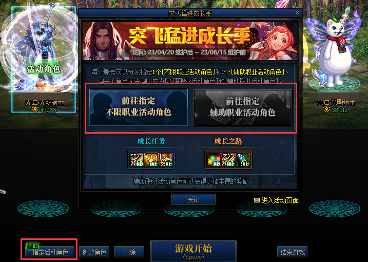登录游戏后,在角色选择页面的左下角有【指定活动角色】按钮,点击即可选择。辅助职业仅可选择【奶爸、奶妈、奶萝】;【不限职业活动角色】可以选择任意110级角色(包括辅助职业)