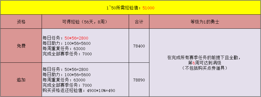 免费与购买追加档位的经验值一样,每日凌晨6点刷新任务,完成所有每日任务可得50点经验值,56天可得2800点经验值。