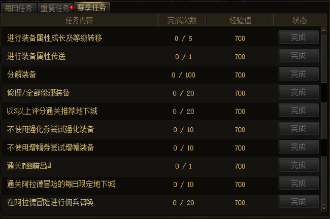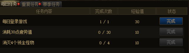 赛季任务一共10个,完成后不刷新任务内容与次数。全部完成共可得7000点经验值。