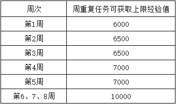 免费与购买追加档位经验值一样,每周完成重复任务可获经验有上限值,每周四凌晨6点刷新任务,周数为8周,共可获得63000点经验值。