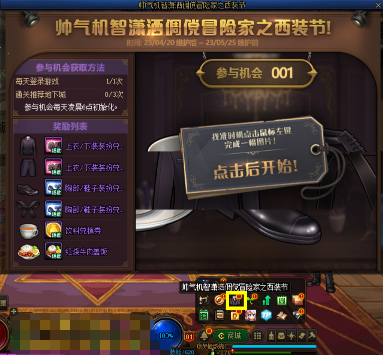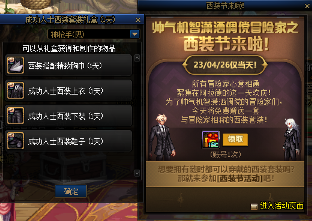 4月26日西装节可额外点击活动图标领取一套西装(一天)。
