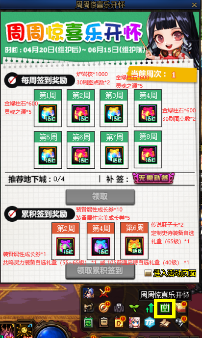 点击消息通知栏处活动图标,即可参与活动。每周累计通关4次推荐地下城,即可领取本周签到奖励。累积签到2次、4次、6次可获得额外奖励。