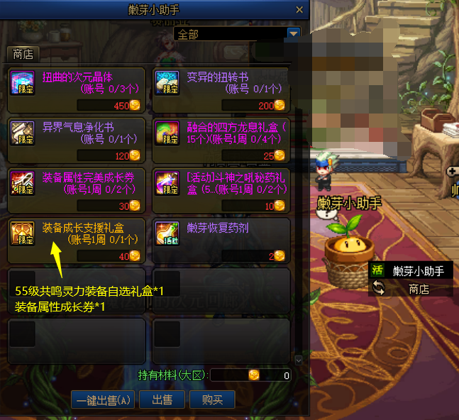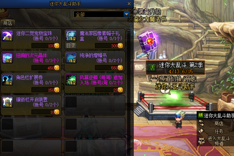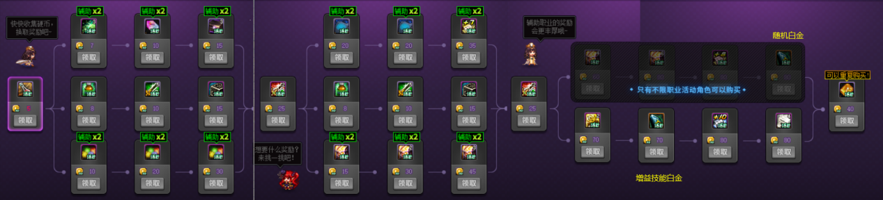 辅助职业活动角色比不限职业活动角色,多出大量装备成长材料,如下图所示。完成每周任务获取硬币,还可在活动商店兑换专属增益技能+1白金徽章、+10增幅券、灿烂徽章等道具。