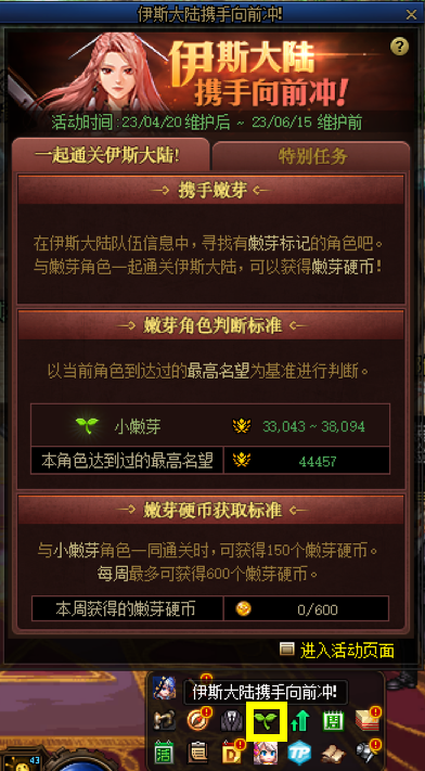 活动期间,角色历史名望值在33043~38094之间的角色被判定为嫩芽角色,非嫩芽角色与嫩芽角色一同通关伊斯大陆副本,即可获得嫩芽币。通关一次获得150嫩芽币,每账号每周上限获得600个。可在赛丽亚旅馆暂驻Npc【嫩芽小助手】的商店处兑换心仪道具。
