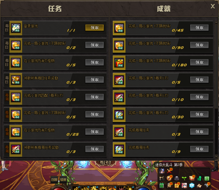完成消息通知栏处活动图标的每日任务、每周任务与成就任务,可获得迷你宠物、灿烂的黄色/绿色徽章自选礼盒、完美成长券等道具奖励。