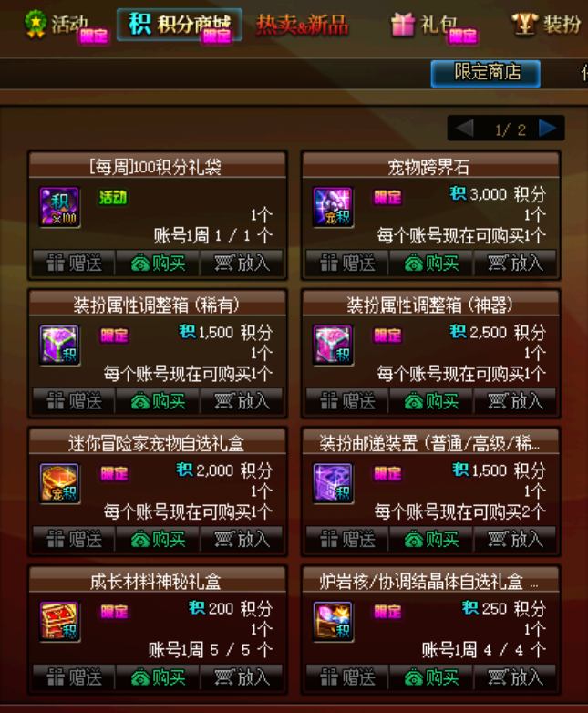 主要通过完成积分商城任务与购买每周的100积分礼袋获取积分。使用积分可兑换【装扮邮递装置】、【装扮属性调整箱(神器)】、【迷你冒险家宠物自选礼盒】等心仪道具。