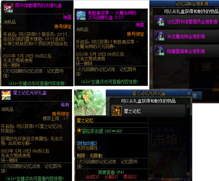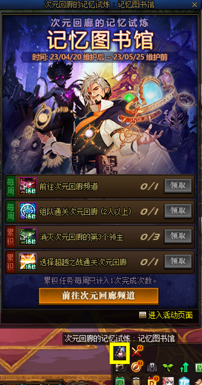 活动期间通过攻略【大魔法师的次元回廊】副本完成每周与累积任务,可在消息通知栏处活动图标,查看活动并获取支援礼盒、回廊奖章、星之记忆光环、全息影像等道具奖励。