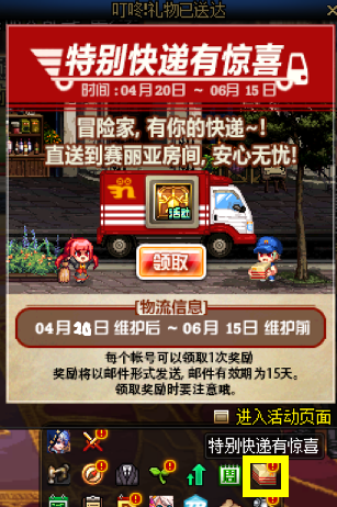 活动期间内任意一天登陆游戏,点击消息通知栏处活动图标即可领取快递。