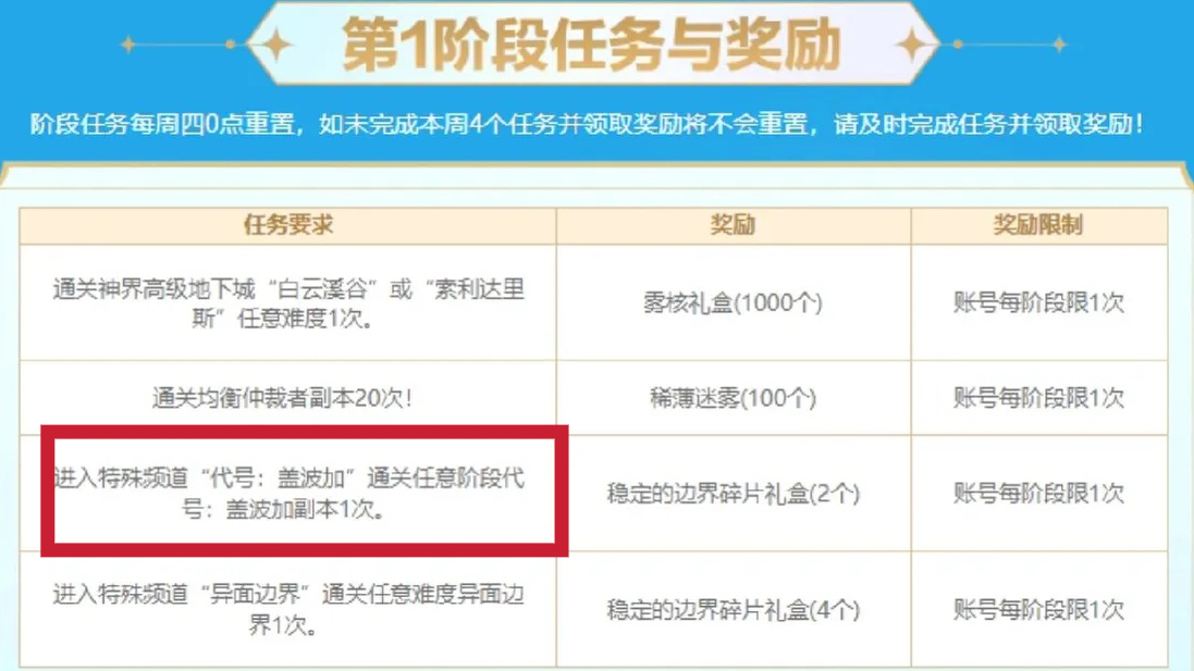 【3】通关1次盖波加,领取2个稳定的边界碎片。