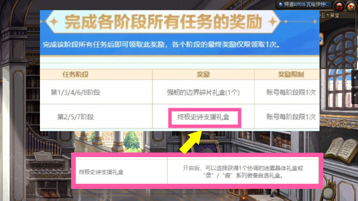 【2/5/7阶段】:核心奖励来了,各领取1个终极史诗支援礼盒,开启后,可选择获得【改1晶体】或【录/痕自选史诗】,一共3个。