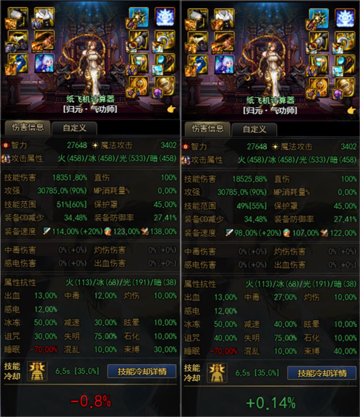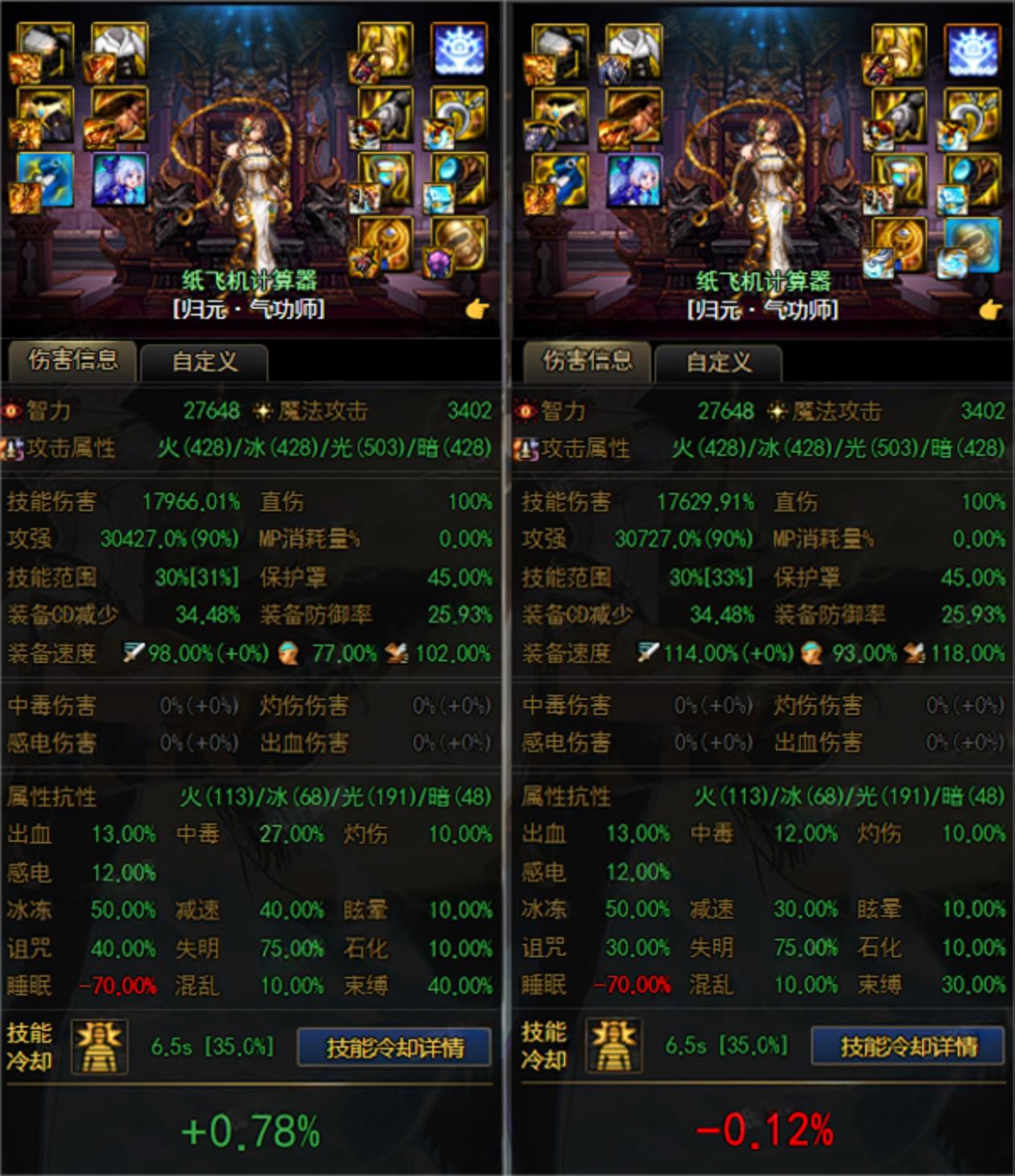 如果选择首饰贴膜1件斗志,则CD37.76%,基本持平,然后伤害98.21%,低于攻速劳1.8%。