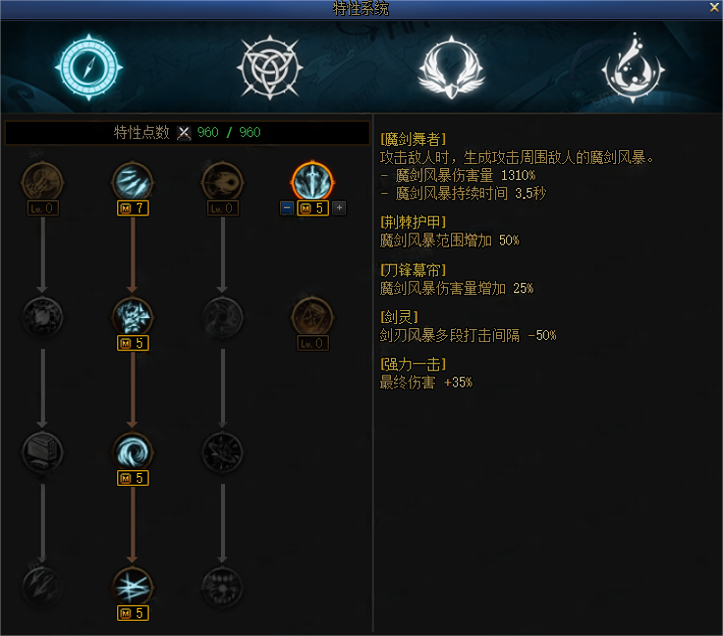 【线路二】魔剑舞者7、荆棘护甲5、刀锋幕帘5、剑灵5、强力一击5。