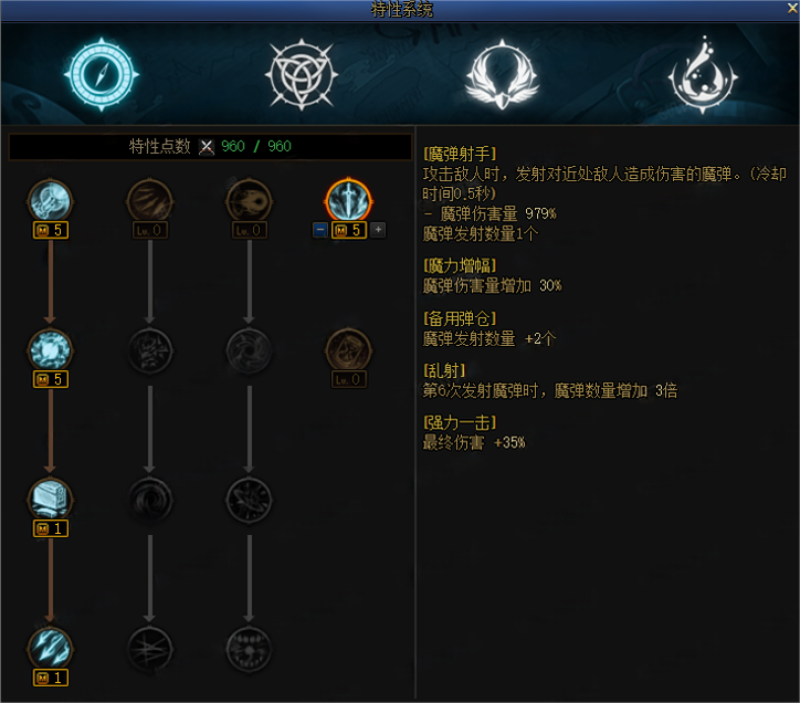 【线路一】魔弹射手5、魔力增幅5、备用弹仓1、乱射1、强力一击5。