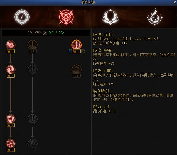【线路一】快攻:连击3、快攻:突袭3、快攻:闪影3、势如破竹1、强力一击5。
