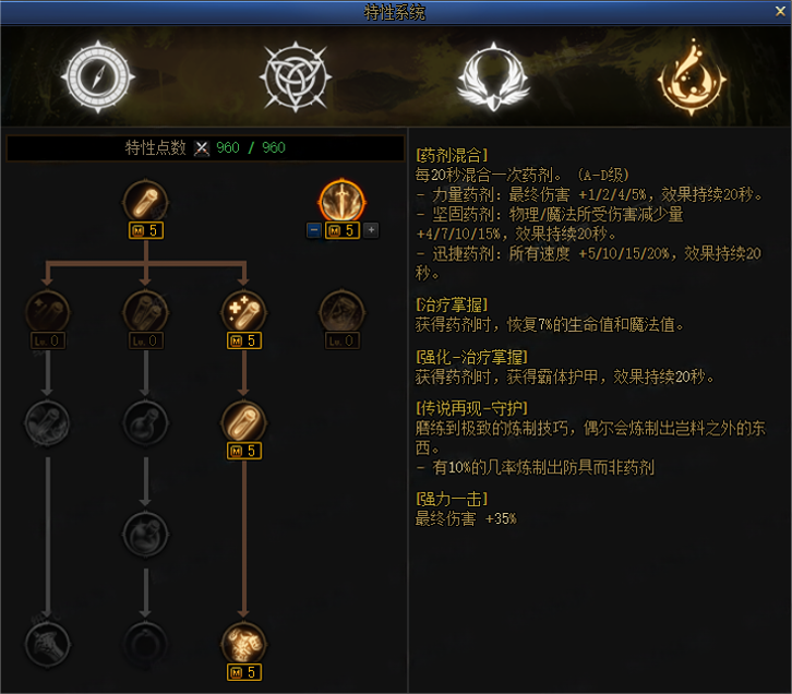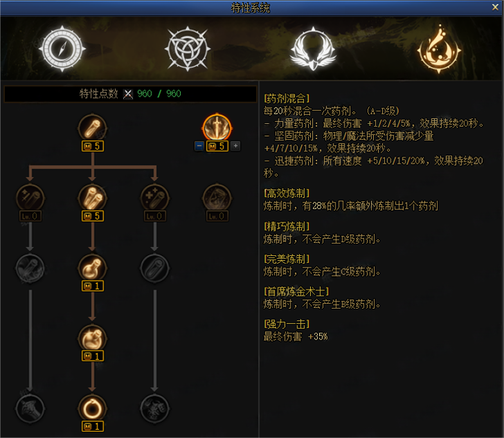 【线路二】药剂混合5、高效炼制5、精巧炼制1、完美炼制1、首席炼金术士1、强力一击5。