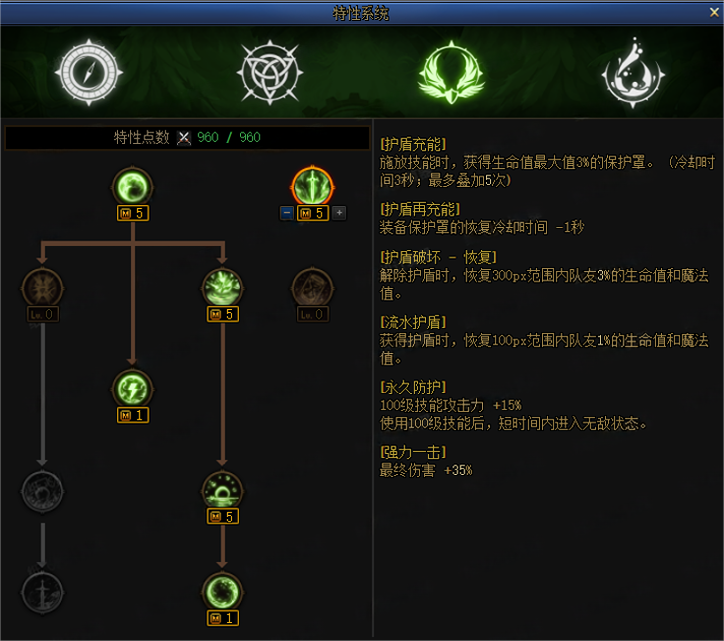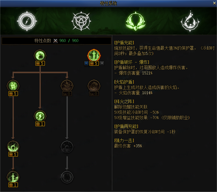 【线路一】护盾充能5、护盾破坏爆炸5、火焰护盾5、拜火之阵1、护盾再充能1、强力一击5。