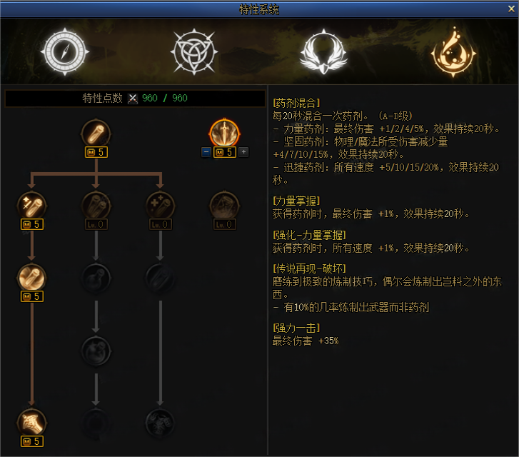 【线路一】药剂混合5、力量掌握5、强化力量掌握5、传说再现破坏5、强力一击5。