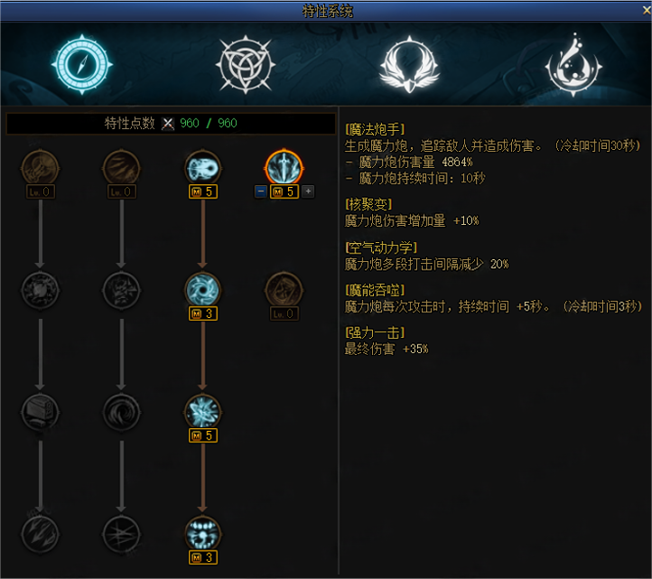 【线路三】魔法炮手5、核聚变3、空气动力学5、魔能吞噬3、强力一击5。