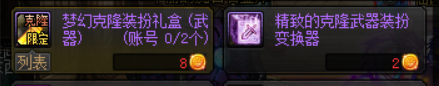 同样在迷你不知火舞商店当中可以兑换到克隆武器装扮,8个SNK特别金币可以兑换一个梦幻克隆武器装扮礼盒,再使用2个金币即可兑换克隆武器装扮变换器,将梦幻克隆装扮升级成稀有克隆装扮,总计需要5个宝物盒子解决。