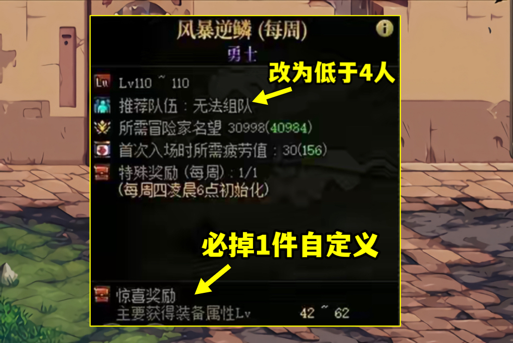 风暴逆鳞周常本,每周限制挑战1次,消耗30疲劳,账号上限10个角色,包括“普通、冒险、勇士”三种难度。相信很多玩家都和秀儿一样,很久都没打了吧,想当初,自定义掉率高,搞了10个角色打,为此,做出了如下改版。