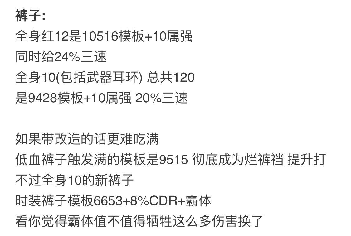 这裤子对红10党来说相当不错了,强度足够。为什么要纠结12触发满?是就差那点影响游戏体验了吗?同位置的120时装裤子既不是面向多数玩家的,伤害也不是最强,厉害的地方在霸体速度和少量CD的均衡性。全程霸体在下个版本是个挺可贵的属性。其他直伤的也就是各种属强裤子了,通用性还好点。