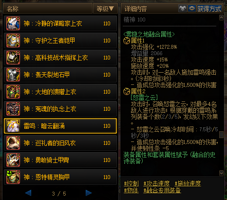 雷鸣-单件固定属性攻击强化+1272.8%,其中上衣提供15%攻击速度加成+20%释放速度加成,其余部位提供功能性加成;套装属性提供特效攻击。该套装就是为大天域流派而制作的,无论是攻击强化还是特效伤害,都提高了流派的输出伤害和输出频率,打BOSS时刮起来更快了(bushi)。总结:推荐大天域流派的小号使用。