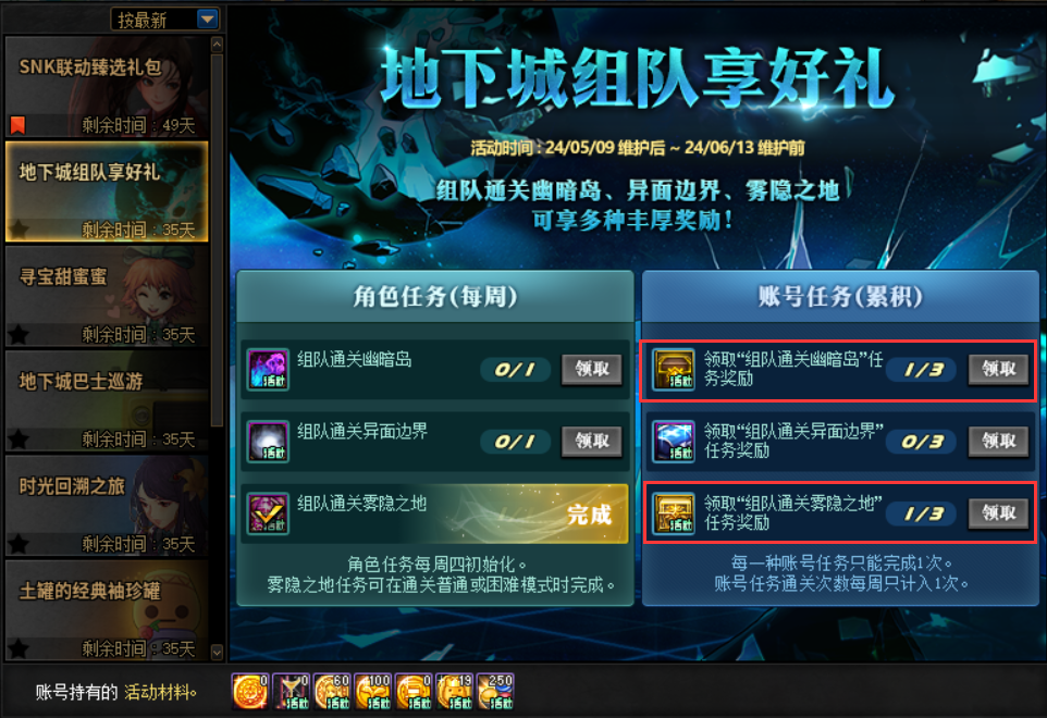 组队通关幽暗岛、异面边界、雾隐之地,即可在活动中心的界面当中领取奖励。