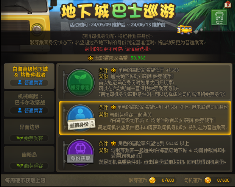 司机角色带领嫩芽角色通关均衡仲裁者、白海高级地下城、巴卡尔攻坚战、异面边界和幽暗岛可以分别获得司机硬币和嫩芽硬币。