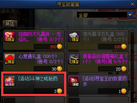 使用寻宝王的硬币可以在活动商店当中兑换奖励,其中所有限定奖励兑换完需要消耗1210枚寻宝王的硬币。斗神之吼秘药单个需要3硬币,那么全勤的条件下可以兑换(1725-1210)/3≈171个。