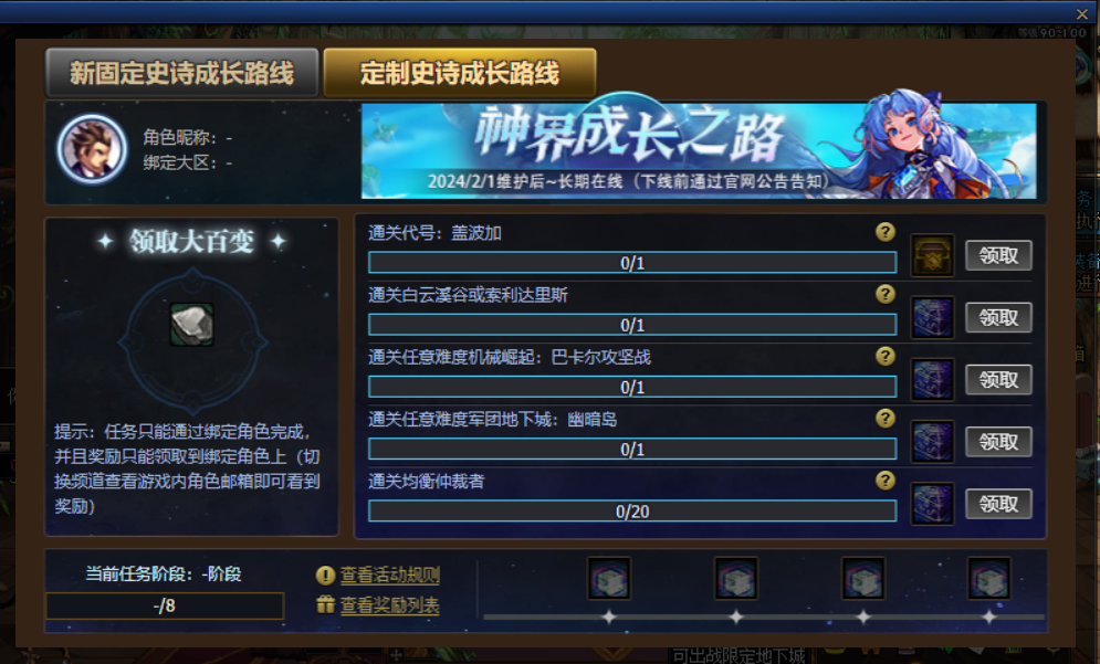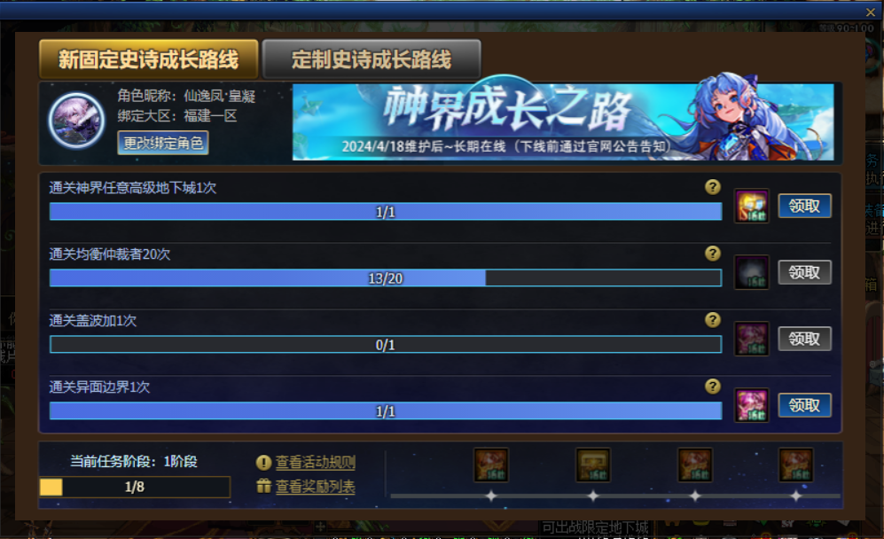 随着全新固定史诗套装的上线,附属的成长活动也上架到了神界成长之路当中,每周通关任意高级地下城、均衡仲裁者、代号:盖波加、异面边界,就可以完成每周任务,获取雾核礼盒(1000个)、稀薄迷雾礼盒(100个)、稳定的边界碎片礼盒(2个)、稳定的边界碎片礼盒(4个)。