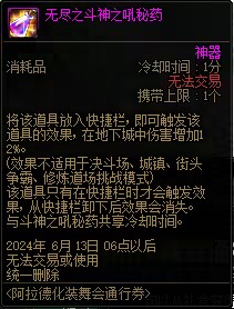 购买阿拉德化装舞会通行券,1级就可以获得无尽之斗神之吼秘药礼盒,无尽之斗神之吼秘药可以用到6月13日,有了无尽之斗神之吼秘药的角色在道具到期之前,就不需要斗神之吼秘药了。