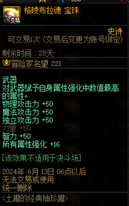 宝珠的属性为赋予自身属性强化中最高数值的属性、三攻+50、力智+50、所有属性强化+16。对于输出职业来说,这个无疑是最强的武器附魔了,在如今的袖珍罐以及攻坚竞拍当中出现了就是非常受欢迎的存在。