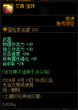 艾肯宝珠的属性为物理和独立攻击力+30、攻速+5%、所有属性强化+15和命中率+2%,是物理百分比职业的固伤职业的专属附魔。相较于绝灭之爆龙王巴卡尔附魔来说,仅仅多了一些攻速和命中率,名望值还不如巴卡尔,需要的小伙伴建议直接买巴卡尔。