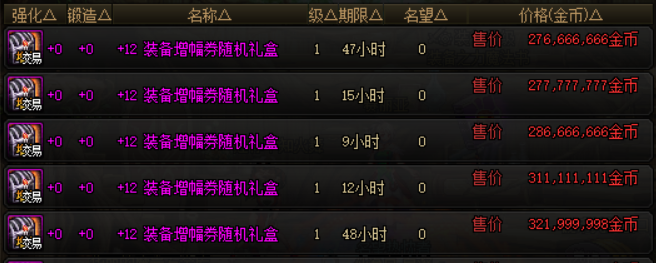 打开之后可以在成功率为30%、50%、70%、90%四种增幅券当中,随机获得一种,这四种增幅券也都是可以交易的。价格统计上,30%概率的为1.9亿、50%概率的为3.1亿、70%概率的为5亿、90%概率的为7亿,而增幅券礼盒的价格为2.8亿。有增幅需求的小伙伴可以根据自己的需求去购买增幅券,不过开启礼盒获得30%成功率的概率较大,所以也可以考虑直接购买增幅券,碰碰运气。