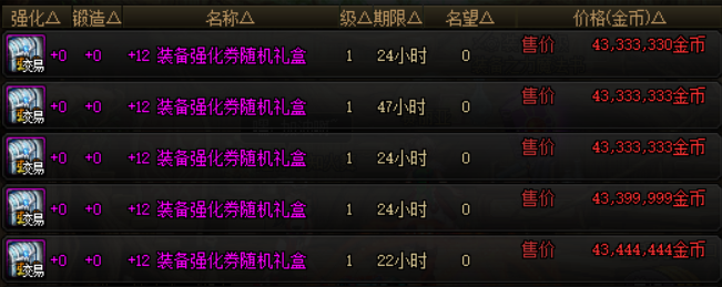 打开之后可以在成功率为30%、50%、70%、90%四种强化券当中,随机获得一种,这四种强化券同样都是可以交易的。价格统计上,30%概率的为3500万、50%概率的为4700万、70%概率的为5000万、90%概率的为9200万,而增幅券礼盒的价格为4300万。不过现阶段而言,有强化需求的小伙伴也不建议入手了,周年庆马上到来,按照以往的惯例会有+13券子赠送,笔者建议勇士们观望一下。