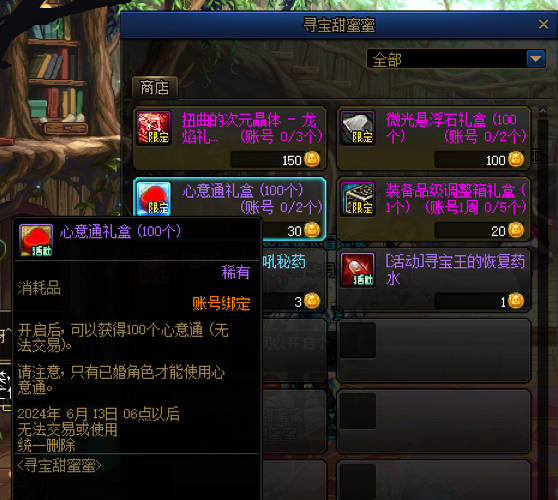 顺带一提,勇士们通过种植爱情树或者通关结婚副本(关爱之摩伽陀地下城)也可获得心意通,不过比较麻烦,现版本一般不通过该途径获得心意点。