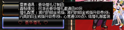 豪华婚礼,需要消耗1张豪华婚礼定制函(一方支付即可),豪华婚礼定制函需通过商城购买(14888点券单角色可购买一次,32740点券可无限制购买)。完成婚礼可获得简约的铂金戒指、简约的铂金戒指升级券、闪亮的白玉戒指升级券、100心意通、结婚礼服套装。