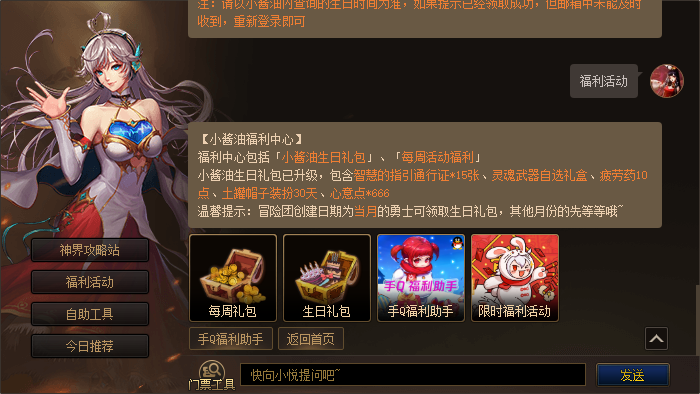 在小酱油里面,勇士们点击福利活动,每年可领取一次生日礼包,里面包含666心意通。若勇士们是在5月创建冒险团,那么千万别错过该福利。