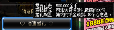 普通婚礼,需要花费50万金币(一方支付即可),完成婚礼可获得简约的铂金戒指、10个心意通。