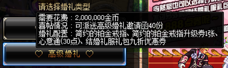 高级婚礼,需要花费200万金币(一方支付即可),完成婚礼可获得简约的铂金戒指、简约的铂金戒指升级券、10个心意通。