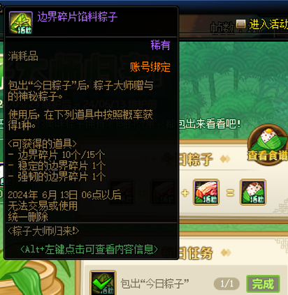 同时,该活动也有一个每日任务,即包出今日粽子,勇士们按照活动要求提供材料、制作对应的粽子即可。每日任务的奖励为边界碎片馅料粽子,打开之后勇士们可以从10个边界碎片、15个边界碎片、1个稳定的边界碎片、1个强韧的边界碎片中随机获得一个。