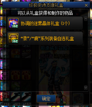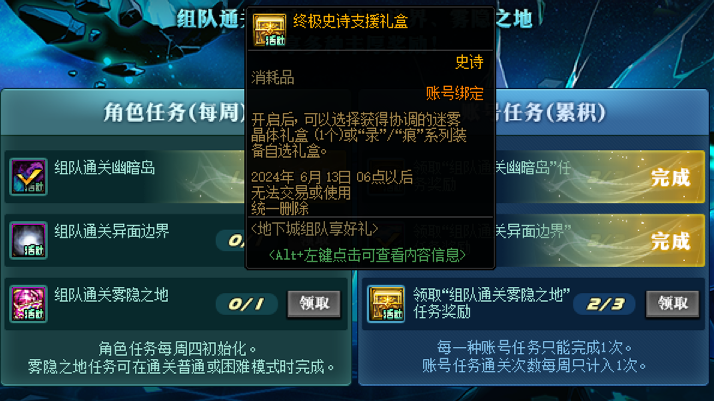 在地下城组队享好礼活动中,勇士们累积领取3次“组队通关雾隐之地”任务奖励,可获得1个终极史诗支援礼盒,从中可以选择获得1个“录”/“痕”系列装备自选礼盒或者改1晶体。
